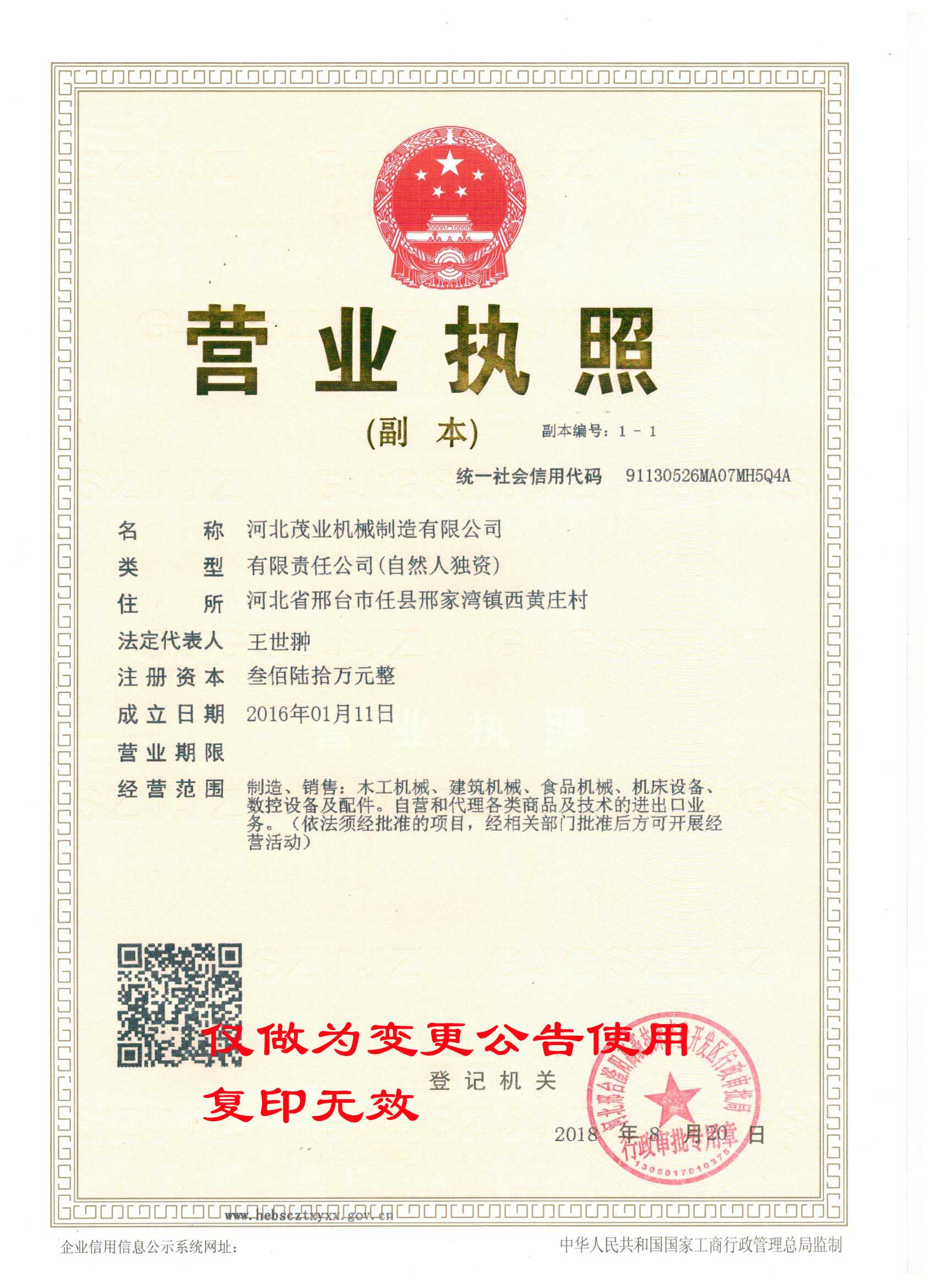 我司邢臺茂業機械制造有限公司,因公司業務發展的需要,現已整體變更為河北茂業機械制造有限公司,并于2018820日取得河北邢臺滏陽高新技術產業開發區審批局頒發的營業執照。現將有關事項公告如下: